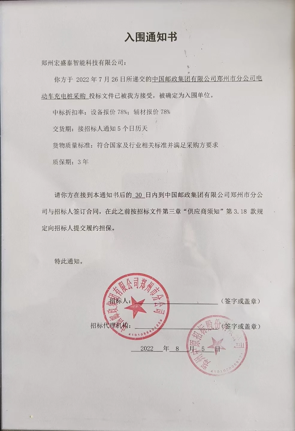 郑州邮政公司充电桩投标入围